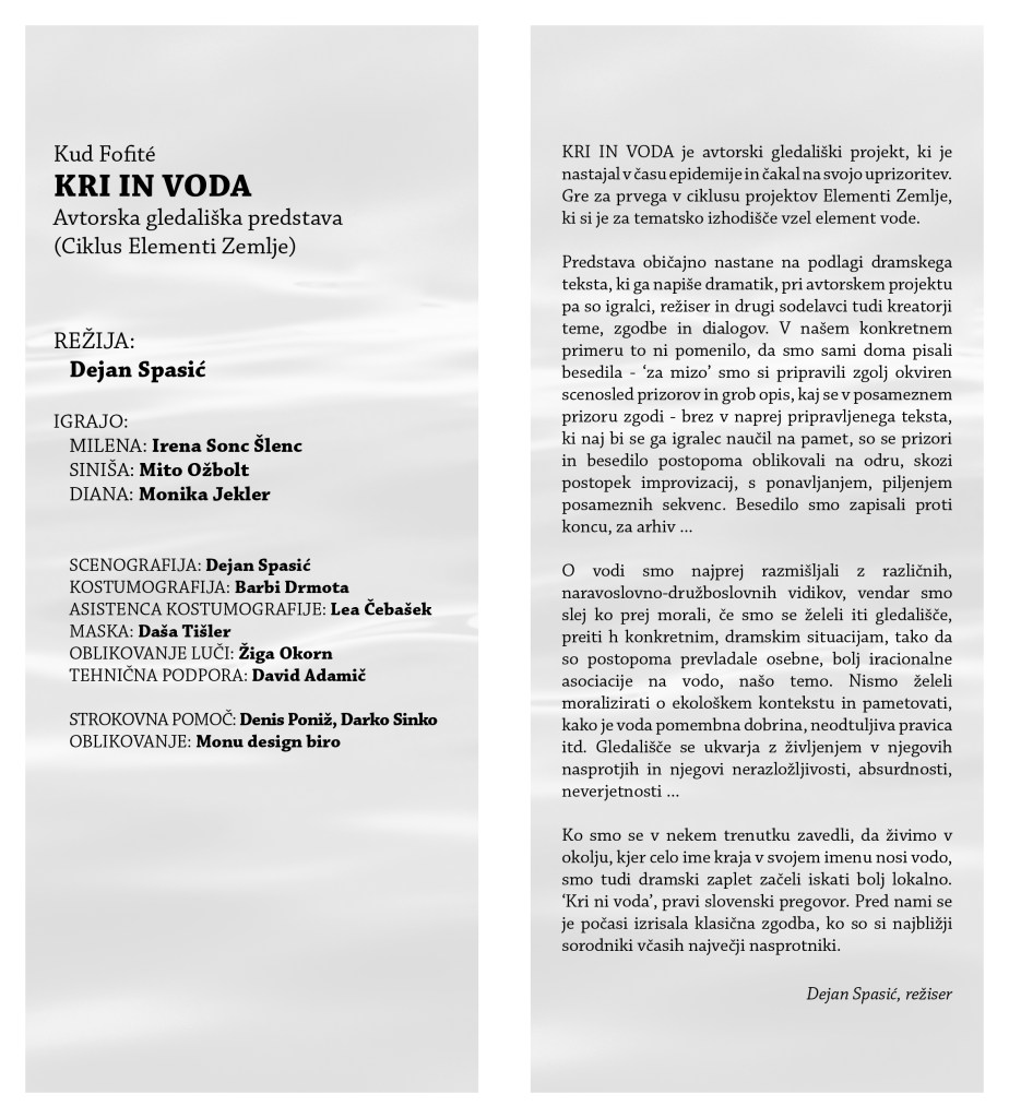 Z avtorskim projektom Kri in voda Kud Fofite začenja ciklus projektov s skupnim naslovom Elementi zemlje. Projekt, ki nastaja skozi postopek improvizacij, brez dramske predloge, se ukvarja z vprašanji družinskih vezi, disfunkcionalnosti družinskih odnosov in posledic le-teh.